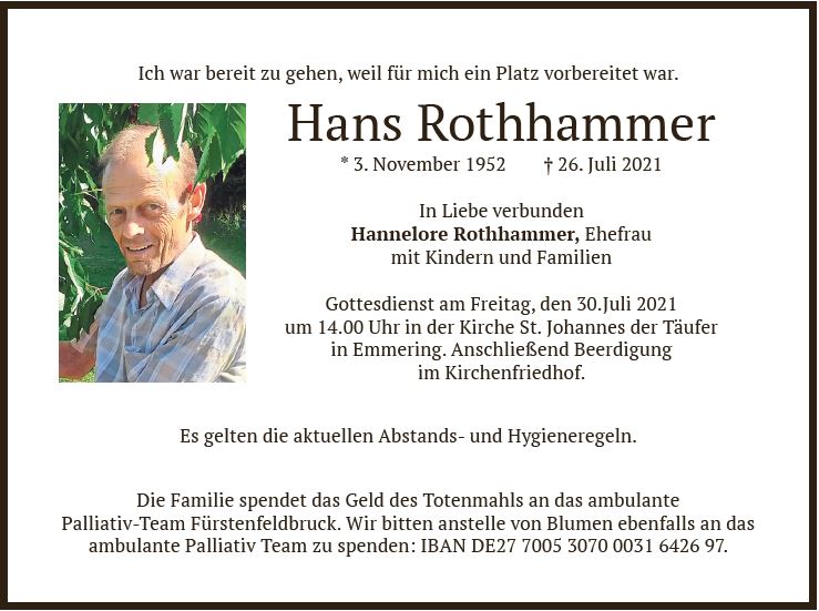 Gottesdienst am Freitag, den 30.Juli 2021 um 14.00 Uhr in der Kirche St.Johannes der Täufer in Emmering. Anschließend Beerdigung im Kirchenfriedhof. Es gelten die aktuellen Abstands- und Hygieneregeln.