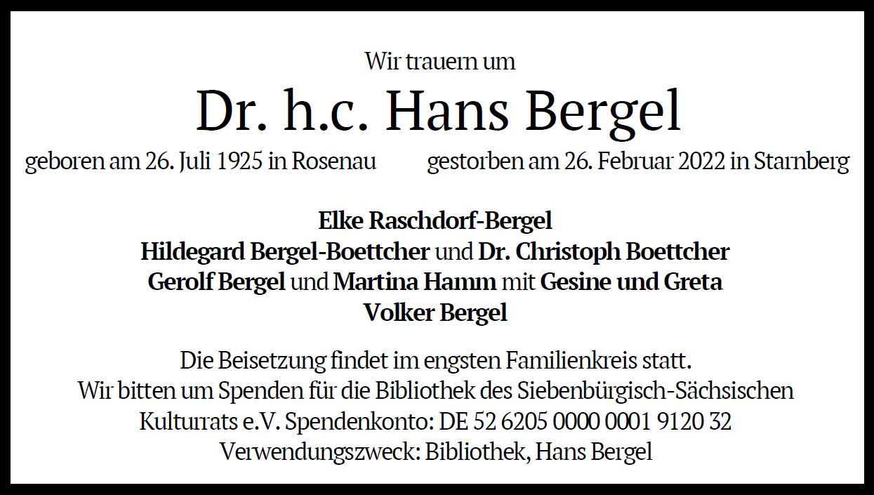 Wir trauern um Herrn Dr. h.c. Hans Bergel * 26.07.1925 † 26.02.2022 |