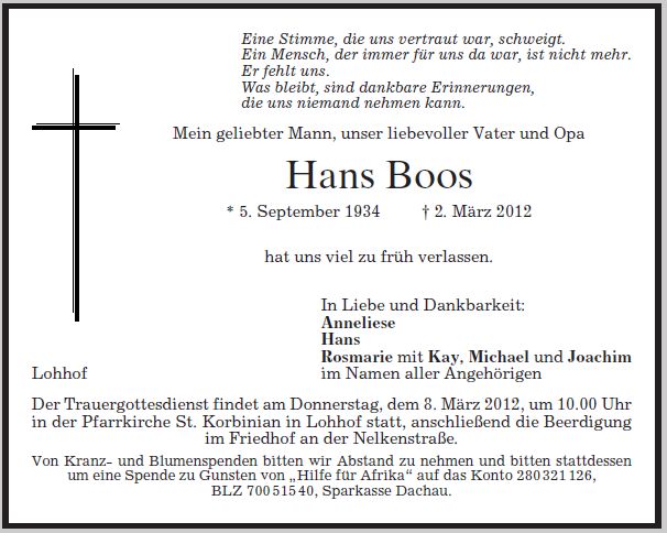 Gottesdienst am Donnerstag, dem 8. März 2012, um 10:00 Uhr in St. Korbinian in Lohhof Beerdigung anschließend um 11:00 Uhr im Friedhof Lohhof an der Nelkenstraße