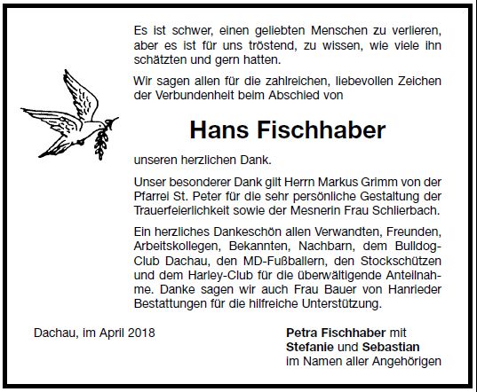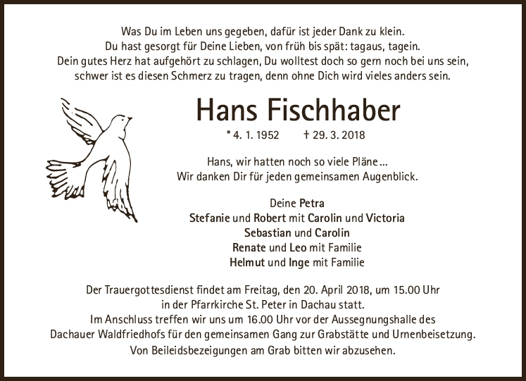 Der Trauergottesdienst findet am Freitag, den 20. April 2018, um 15 Uhr in St. Peter, Dachau statt. |