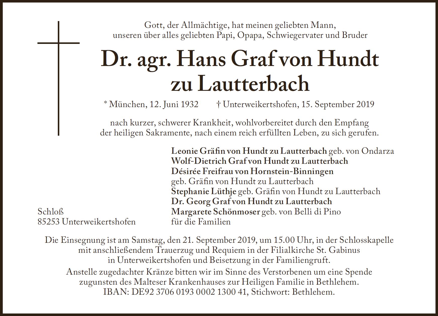 Wir trauern um Herrn Dr. Hans Graf von Hundt zu Lautterbach * 12.06.1932 † 15.09.2019 |