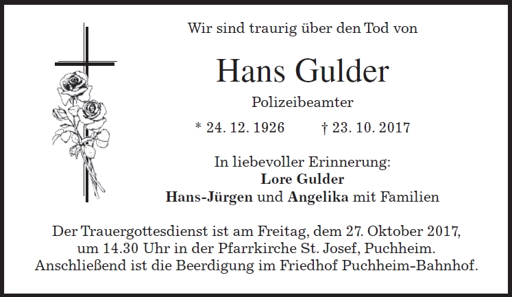um 14:30 Uhr in der Pfarrkirche St. Josef, Puchheim. Anschließend ist die Beerdigung im Friedhof Puchheim-Bahnhof.