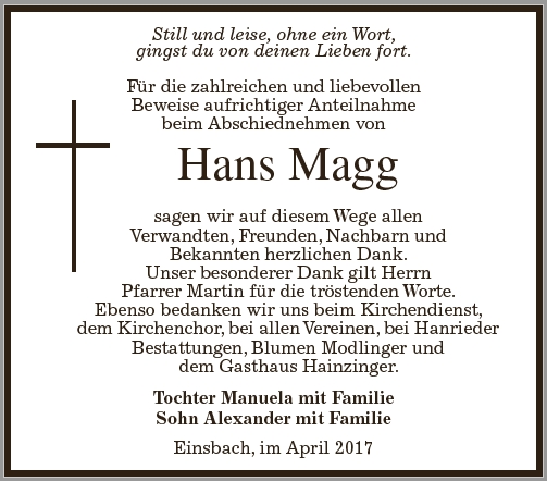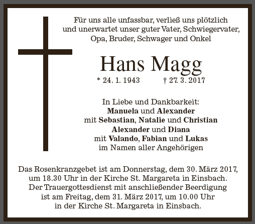 Wir trauern um Herrn Hans Magg Maurer * 24.01.1943 † 27.03.2017 |