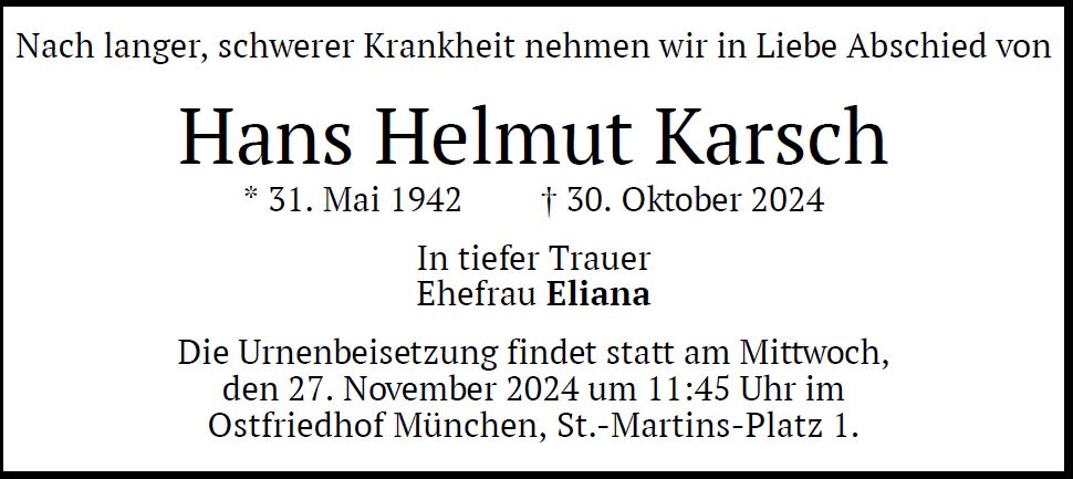 Wir trauern um Herrn Hans Helmut Karsch Ingenieur * 31.05.1942 † 30.10.2024 |