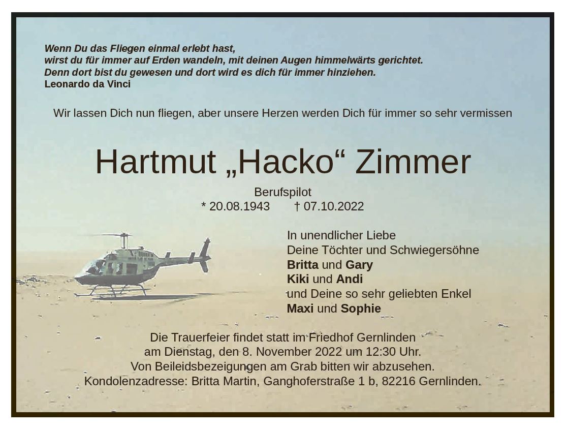 Wir trauern um Hartmut "Hacko" Zimmer Berufspilot * 20.08.1943 † 07.10.2022 |