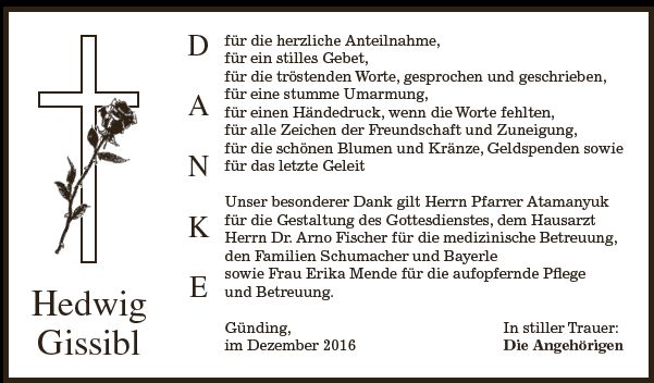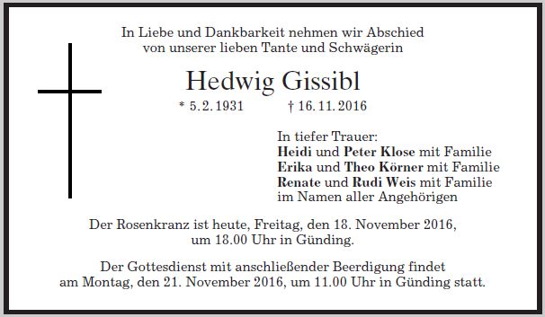 Gottesdienst am Montag, dem 21. November 2016, um 11:00 Uhr in Günding. Beerdigung am Montag, dem 21. November 2016, um 11:45 Uhr im Günding.