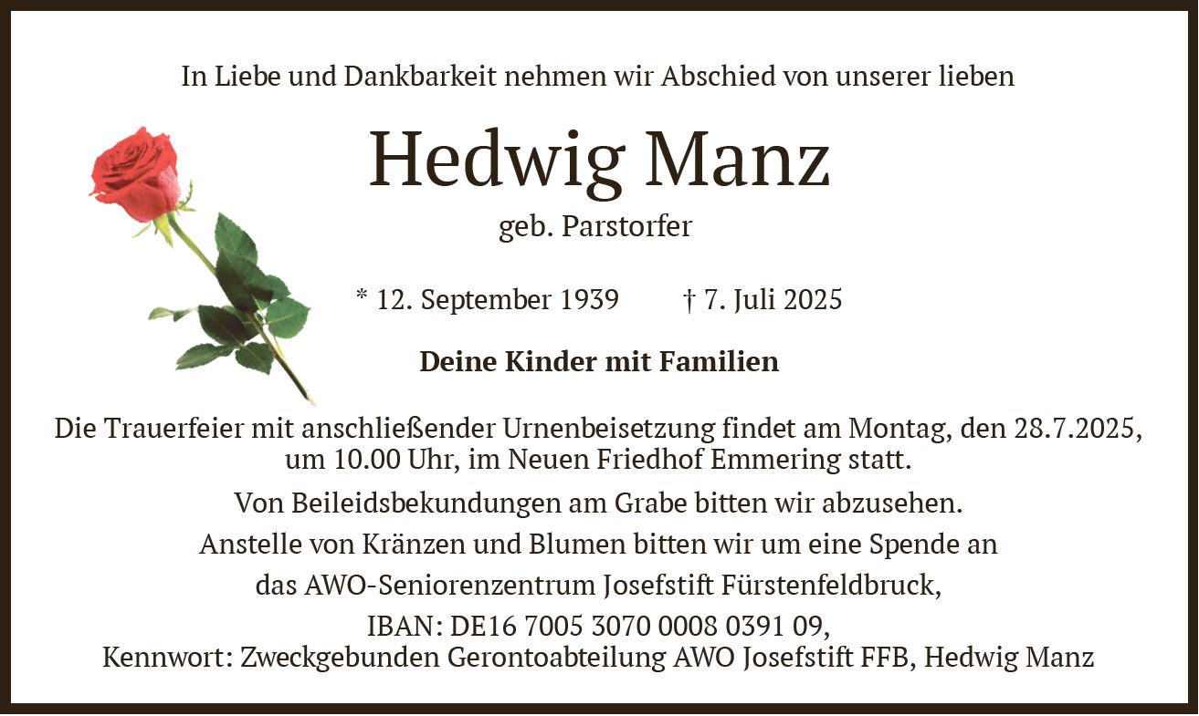 Wir trauern um Frau Hedwig Manz geb. Parstorfer * 12.09.1939 † 07.07.2025 |