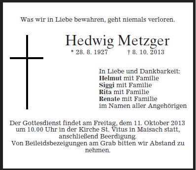 Gottesdienst am Freitag, dem 11. Oktober 2013, um 10:00 Uhr in St. Vitus in Maisach, anschließend die Beerdigung.