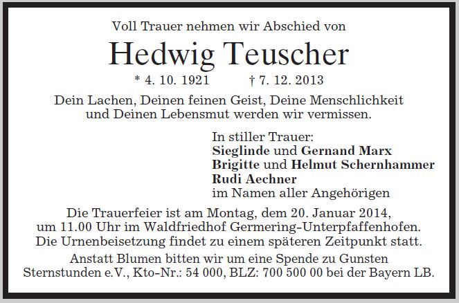Die Trauerfeier ist am Montag, dem 20. Januar 2014, um 11:00 Uhr im Waldfriedhof Germering Unterpfaffenhofen Die Urnenbeisetzung findet zu einem späteren Zeitpunkt statt.