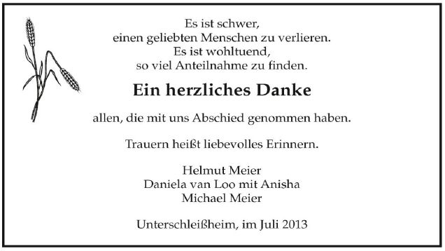 Trauerfeier mit anschließender Beerdigung am Mittwoch, dem 3. Juli 2013, um 10:00 Uhr im Waldfriedhof Unterschleißheim