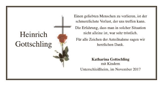 Wir trauern um Herrn Heinrich Gottschling Gabelstaplerfahrer im Ruhestand * 10.07.1943 † 09.11.2017 |