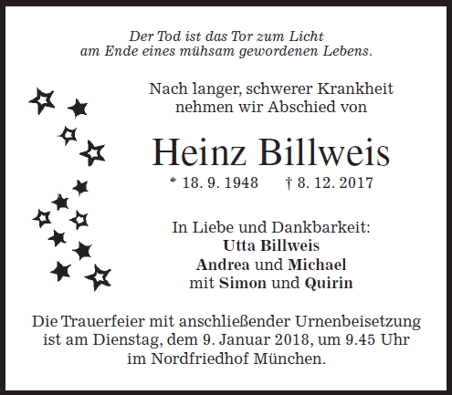 Die Trauerfeier mit anschließender Urnenbeisetzung ist am Dienstag, dem 9. Januar 2018, um 09:45 Uhr im Nordfriedhof München. |