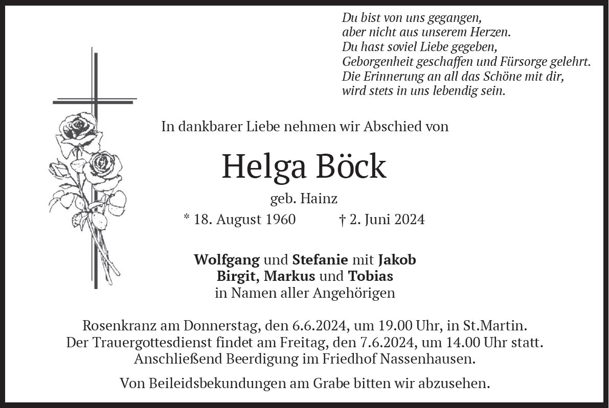 Wir trauern um Frau Helga Böck geb. Hainz * 18.08.1960 † 02.06.2024 |