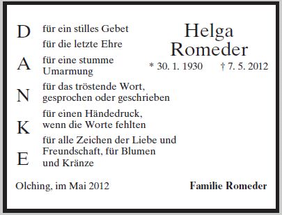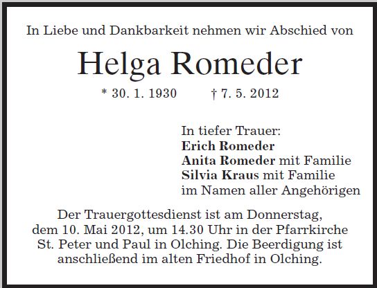 Der Gottesdienst ist am Donnerstag, dem 10. Mai 2012, um 14:30 Uhr in der Pfarrkirche St. Peter und Paul in Olching. Die Beerdigung ist anschließend im alten Friedhof Olching.