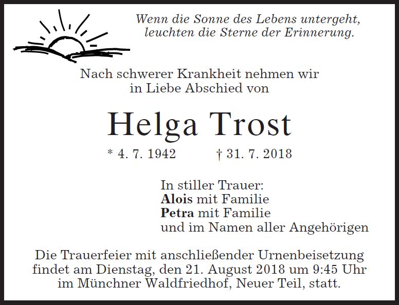Die Trauerfeier mit anschließender Urnenbeisetzung findet am Dienstag, den 21. August 2018, um 09:45 Uhr im Münchner Waldfriedhof, Neuer Teil, statt. |