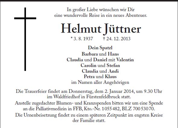 Trauerfeier am Donnerstag, dem 2. Januar 2014, um 09:30 Uhr im Waldfriedhof Fürstenfeldbruck