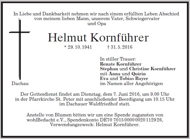 Gottesdienst am Dienstag, dem 7. Juni 2016, um 09:00 Uhr in St. Peter. Beerdigung am Dienstag, dem 7. Juni 2016, um 10:15 Uhr im Dachauer Waldfriedhof.
