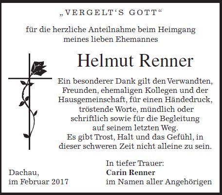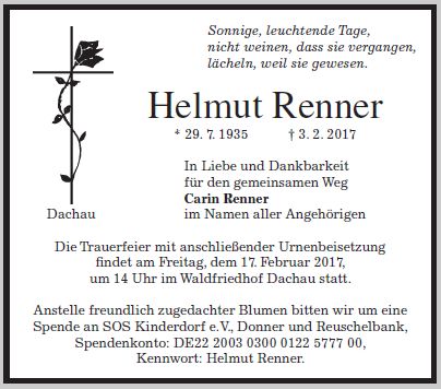 Die Trauerfeier mit anschließender Urnenbeisetzung findet am Freitag, dem 17. Februar 2017, um 14 Uhr im Dachauer Waldfriedhof statt. |