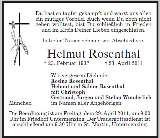 Die Beerdigung findet am Freitag, dem 29.4.2011, um 9:00 Uhr auf dem Friedhof in Untermenzing statt. Der Gottesdienst ist anschließend um 9:30 Uhr in St. Martin, Untermenzing
