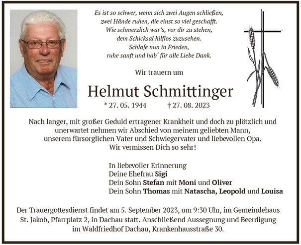 Wir trauern um Herrn Helmut Schmittinger Justizangestellter * 27.05.1944 † 27.08.2023 |