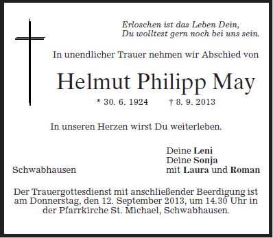 Wir trauern um Herrn Helmut Philipp May Schnürmeister * 30.06.1924 † 08.09.2013 |