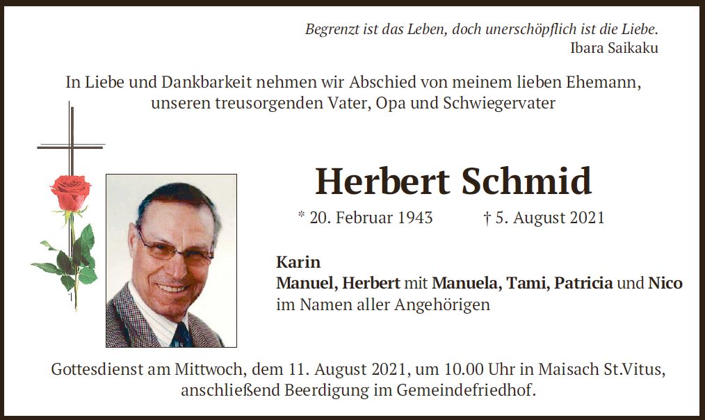 Der Gottesdienst findet am Mittwoch, dem 11.8.2021 in St.Vitus Maisach um 10 Uhr statt. Anschließend die Beerdigung auf dem Gemeindefriedhof in Maisach.
