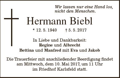 Wir trauern um Herrn Hermann Biebl Elektrotechniker * 12.05.1940 † 05.05.2017 |