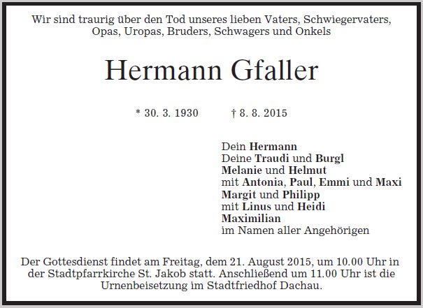 Gottesdienst am Freitag, dem 21. August 2015, um 10:00 Uhr in St. Jakob Urnenbeisetzung anschließend um 11:00 Uhr im Dachauer Stadtfriedhof