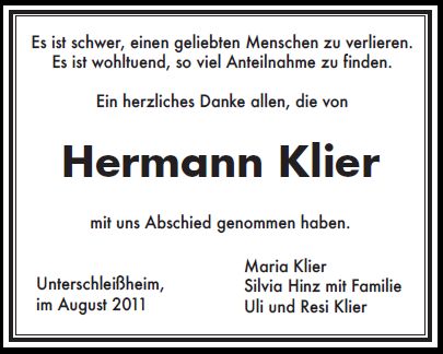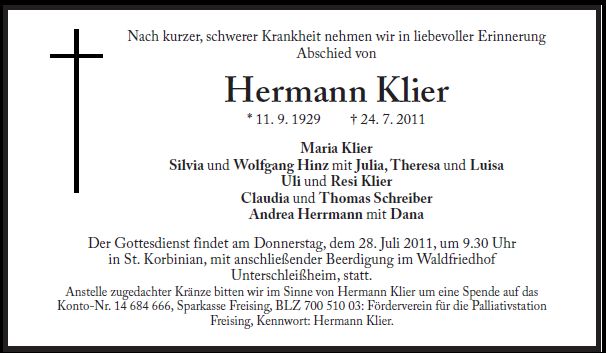 Gottesdienst am Donnerstag, dem 28. Juli 2011, um 09:30 Uhr in St. Korbinian, mit anschließender Beerdigung im Waldfriedhof Unterschleißheim