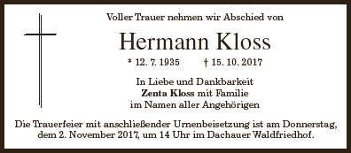 Die Trauerfeier mit anschließender Urnenbeisetzung ist am Donnerstag, dem 2. November 2017, um 14 Uhr im Dachauer Waldfriedhof.
