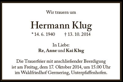 Die Trauerfeier ist am Freitag, dem 17. Oktober 2014, um 15:00 Uhr im Waldfriedhof Unterpfaffenhofen, Germering Die Beerdigung ist am Freitag, dem 17. Oktober 2014, um 15:30 Uhr im Waldfriedhof Unterpfaffenhofen, Germering