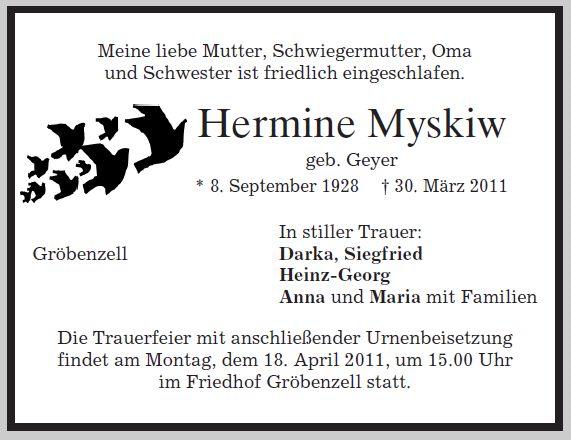 Trauerfeier mit anschließender Urnenbeisetzung am Montag, dem 18. April 2011, um 15:00 Uhr im Friedhof Gröbenzell