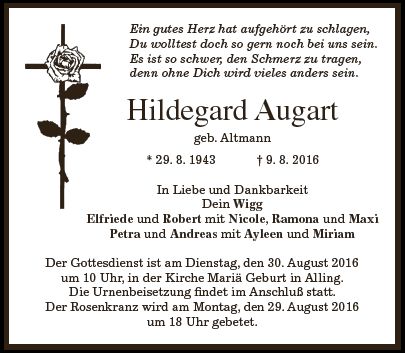 Der Gottesdienst ist am Dienstag, den 30.8.2016 um 10 Uhr in der Kirche Maria Geburt, Alling Die Urnenbeisetzung findet im Anschluß im Friedhof Alling statt.