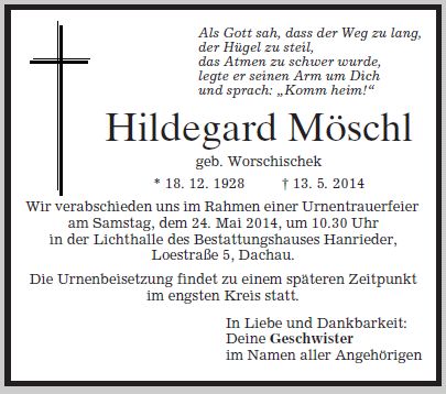 Die Urnentrauerfeier findet am Samstag, dem 24. Mai 2014, um 10:30 Uhr in der Lichthalle des Bestattungshauses Hanrieder, Loestrasse 5, 85221 Dachau statt. |
