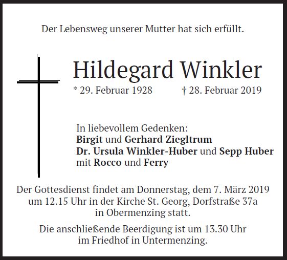 Wir trauern um Frau Hildegard Winkler geb. Eichhorn Hausfrau * 29.02.1928 † 28.02.2019 |