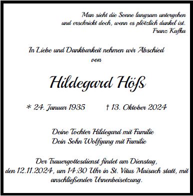 Wir trauern um Frau Hildegard Theresia Höß * 24.01.1935 † 13.10.2024 |