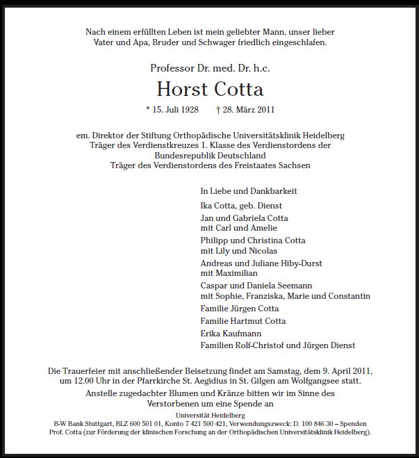 Wir trauern um Herrn Professor Dr. med. Dr. h. c. Horst Cotta * 15.07.1928 † 28.03.2011 |