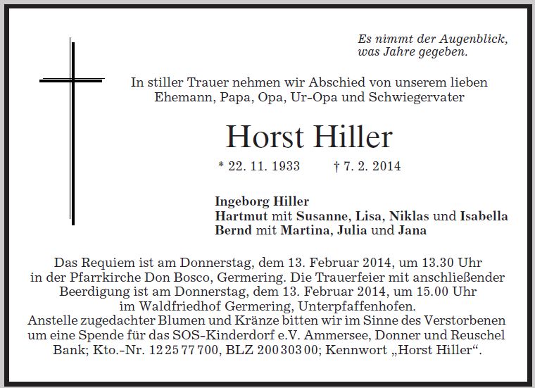 Wir trauern um Herrn Horst Hiller * 22.11.1933 † 07.02.2014 |
