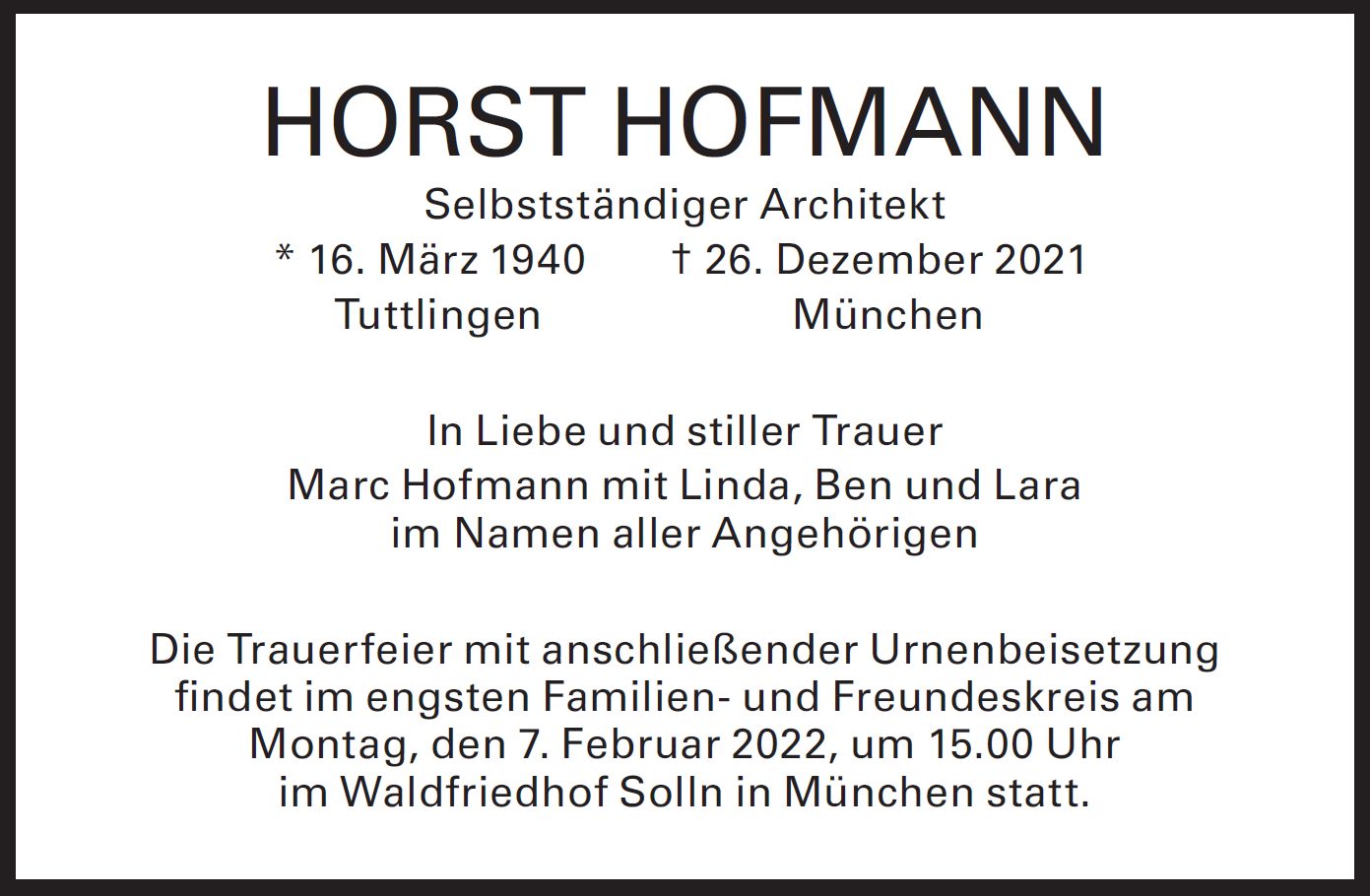 Wir trauern um Herrn Horst Hofmann Architekt * 16.03.1940 † 26.12.2021 |