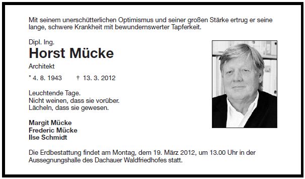 Beerdigung am Montag, dem 19. März 2012, um 13:00 Uhr im Dachauer Waldfriedhof.
