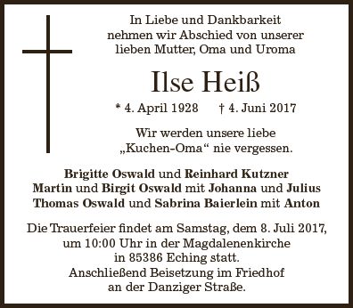 Gottesdienst am 08.07.2017 um 10:00 Uhr in der Magdalenenkirche in Eching Urnenbeisetzung am 08.07.2017 um 10:45 Uhr im Friedhof Eching in der Danziger Straße