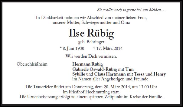 Trauerfeier am Donnerstag, dem 20. März 2014, um 13:00 Uhr im Hochmutting