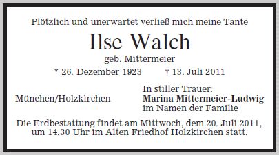 Die Beerdigung findet am Mittwoch, dem 20. Juli 2011, um 14:30 Uhr im Alten Friedhof Holzkirchen statt.