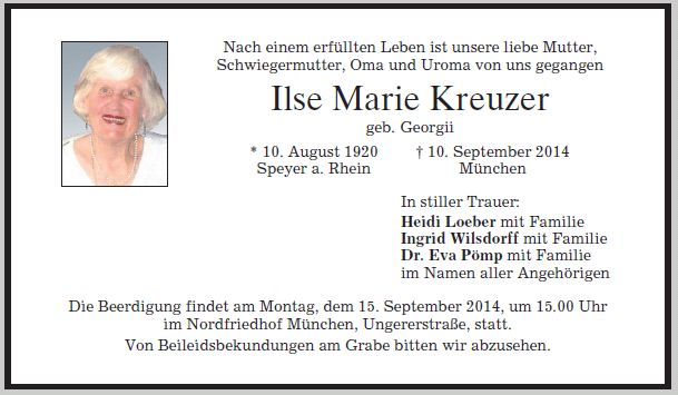 Wir trauern um Frau Ilse Marie Kreuzer geb. Georgii Hausfrau * 10.08.1920 † 10.09.2014 |