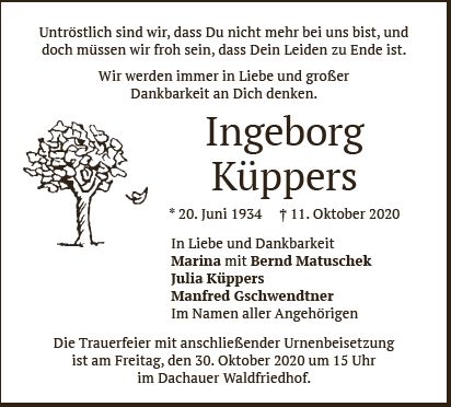 Die Trauerfeier mit anschließender Urnenbeisetzung ist am Freitag, dem 30. Oktober 2020 um 15:00 Uhr im Dachauer Waldfriedhof