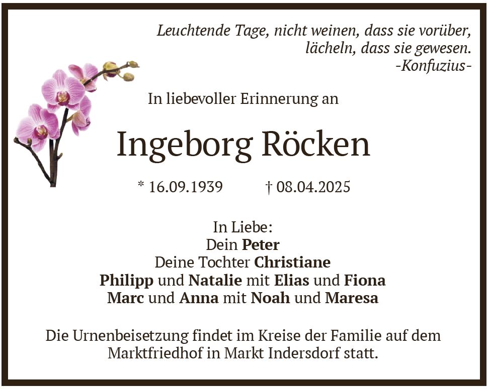 Wir trauern um Frau Ingeborg Röcken geb. Schmarsch Sekretärin * 16.09.1939 † 08.04.2025 |