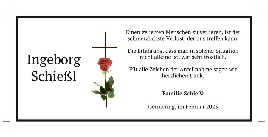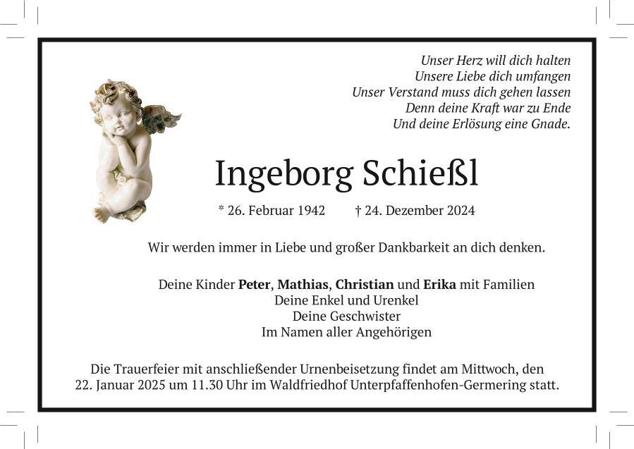 Wir trauern um Frau Ingeborg Schießl geb. Boxan * 26.02.1942 † 24.12.2024 |