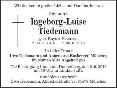 Wir trauern um Frau Dr. Ingeborg Tiedemann geb. Kayser-Petersen Kinderärztin * 14.06.1915 † 26.08.2013 |
