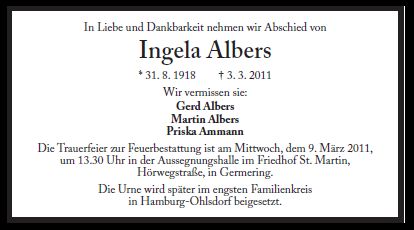 Wir trauern um Frau Ingrid Albers geb. Keup Grafikerin * 31.08.1918 † 03.03.2011 |