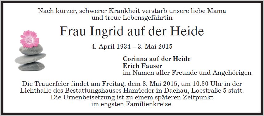 Trauerfeier am Freitag, den 8. Mai 2015, um 10:30 Uhr im Hanrieder Bestattungshaus in Dachau, Loestraße 5 |